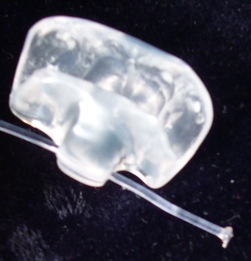 Happily, this danger can be avoided! There are three ways. Greta now uses one of them at night (approach 2) and I, Gregory, use another one (approach 1). And dentists will love approach 3 since, once invented (yes, that is a challenge I'm issuing to you teeth-yankers), it will eliminate all risks (choking, death, lawsuits, etc.) and be very expensive to make (you can just see the dentists’ eyes lighting up with dollar signs as they read this), but users will like it since, in addition to being 100% safe, it will eliminate the need for most adjustments once the fitting, and the teeth, have stabilized, and they won’t need to fit tight or uncomfortably on the front teeth. Users will like not having the 100 pound test monofilament fishing line hanging out their mouths that approaches 1 and 2 utilize. (That sounds bad or dangerous at first, but it’s quite the opposite: it’s easy to adjust it so this smooth line is comfortable just by subtle necklace or ball position movements, and it gives you great peace of mind because it makes you safe—unless you bollix up the modifications.)