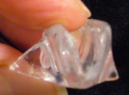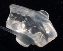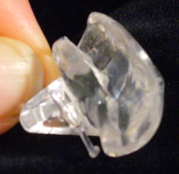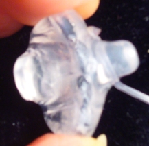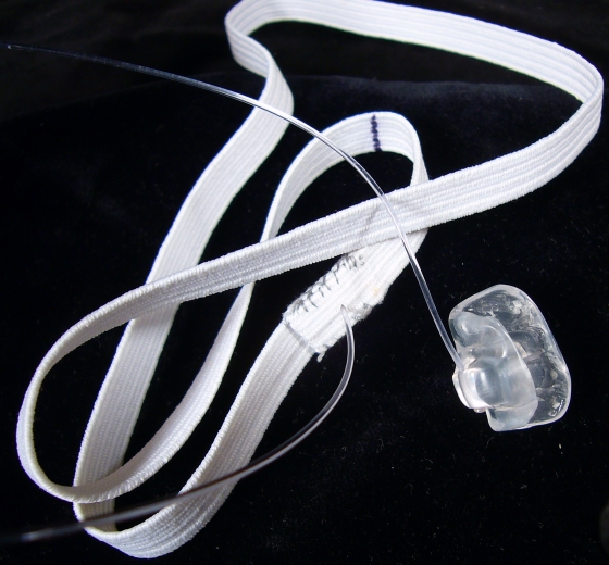 Necklace (used nightly and happily by Greta Clenchem). This involves 23" of flat 3/8" elastic, 12" of 100 pound test monofilament fishing line, and the NTI.The two ends of the elastic are overlapped 1" and sewn together into a necklace with a 22" circumference. The necklace and NTI are hooked together via the fishing line. A 0.0400" hole (see drilling tips!) (bit size #60) is drilled in the NTI (slowly so you don’t melt the NTI material, so I believe a Dremel drill is too fast—I had to use a small power drill which let me go slowly). Drill the hole in the inner nub of the NTI, horizontally.