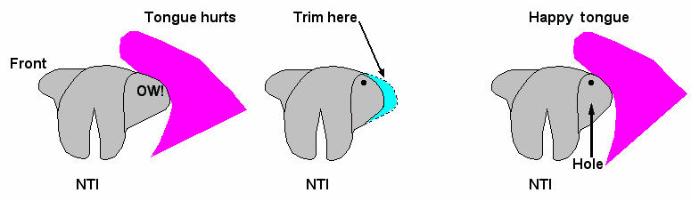 The reason this excess material exists is that some people with an under bite and a lower teeth NTI or an over bite and an upper teeth NTI are going to end up needing it to keep teeth from "falling off the ledge"—which means the teeth come together as opposed to the NTI doing what it’s supposed to: keep back teeth from touching. Either upper front teeth or lower front teeth end up behind or in front of the NTI rather than being kept separated by the NTI—which is the NTI’s main purpose. However, there's more material than most patients need, and this excess material has a fair likelihood of giving the patient a sore tongue: the underside, for lower NTIs, and the topside, for upper NTIs. See the diagram (which also shows where to have a #60 hole drilled [#60 is drill bit size, diameter 0.0400"]—more on that later) below for the details of alleviating this tongue pain.
