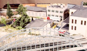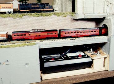 A Bench + Work = Benchwork The 36.5" x 26" benchwork was composed of 1 x 4s at 8" on-center spacing as joists for the ˝" plywood subroadbed on the lower level, and triple-layered 1 x 2 uprights to support the ˝" plywood upper level. The uprights were bolted together and then bolted to the joists. The plywood was screwed down with 1˝" wood screws. I even added corner braces at layout corners. I purposely made the structure tough enough so that one could carry the whole thing, at this point, by using any upright as a handle. I intended that the layout would be able to withstand knocking around during shipping without showing symptoms as a result. I installed six small terminal strips for the lighting system, so that 3mm lamps could be replaced from underneath the layout without any soldering. I installed three Peco turnouts without switch machines—they were to be operated by hand so as to minimize future complications. I installed a stop so that the sliding throttle panel couldn't possibly be pulled out far enough to pull on any of the track feeder wires. I soldered wires to block switches and indicator lights, and feeder wires were soldered to track. There are no connections that can come loose except for lighting, but lamp wires are tightly screwed to the terminal strips, and I don't expect future problems. |