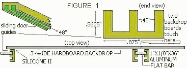 My local home improvement center offers various sliding door guides. I chose 4' x 9/16" x 7/8" plastic ones. I found ones with two U-channels, but one U-channel is all I really needed. I also bought some 1" x 1/8" x 3' aluminum flat bar, some ¾" sheet metal screws, and some Silicone II Window and Door Sealant. I drilled two holes  2.5" apart in the 1 x 4 benchwork joists and the bars as well, then mounted the bars against my layout's end joists. Next I cut the plastic guides in half with a hacksaw so they'd be the same height as Walthers backdrops (2'). Then I laid a thick 2' bead of silicone on lines I drew on the back of the hardboard backdrops; I pressed the plastic guides—channels facing outwards—onto these beads firmly and let them dry overnight.