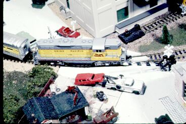 Operations on the Deep Rock Railroad We switch coal cars on the coal siding and various goods at the distribution warehouse and the industrial spurs. A passenger train pauses at the station sidings in the southwest and northeast parts of the layout, and we switch fuel tankers at the fuel siding. The upper level passenger train stops at stations in each of its loops, and passengers can make connections by walking down long stairways to train stations on the lower level. Trolley passengers can make connections at a waiting platform with steps from the middle (Plateau City) level to a lower level station. All switching operations need and use delayed action uncoupling, since all require trains to uncouple cars and then back them into sidings or spurs and leave them there. My wife and I have a memorized sequence of action that we go through when guests arrive. We run through all our switching operations, and we run all four staging track trains through the full mainline circuit. We also make the trolley and upper level passenger train do their thing as well. It's more dynamic action than people usually see at shows, where endless looping is the rule and spotting specific cars to the industries are the exception. |