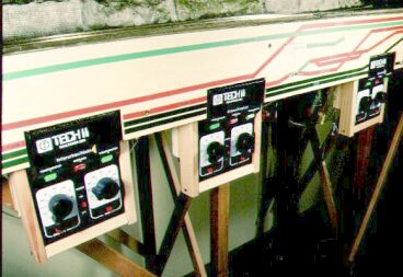A Controversial Prediction Okay, already. Here's the juicy part. I honestly predict that one more control mode will be added to the mix as a layout control system for serious hobbyists: Multi-Throttle Control, my name for an updated version of—you guessed it—our old friend section control! In other words, in some ways you could say that I'm implying that things are going full circle and that the circle progresses through all of the train control modes above, including wireless DCC, and ends up back where it started: at section control (for some of us). This would surely be a nutty prediction to make if I couldn't produce anything to back it up. But I've researched it and I believe I can back it up just fine. Judge for yourself: Multi-Throttle Layout Control—Section Control for the 21st Century In planning my most recent layout, the N-scale Squirrel Valley Railroad, I went all out and went to lots of train shows, conventions, layout tours, etc., where I talked to many people; and then I got brochures and collected articles on every control method ever devised. And I asked the manufacturers many questions. I was building on decades of not just layout building, but twelve years in the software business designing model train simulation software and talking to all kinds of people about their layout wants and needs as well as their software wants and needs with regards to layout design software and train running simulation software. Finally, I made a list of all the wants and needs my wife and I have with regards to our current layout project, and I examined each of the possible layout control methods in turn for how well they filled our needs and how much they would put a dent in our pocketbooks. The results surprised me as much as they may surprise you. Note: Keep in mind that I have a completely operational and very satisfying model railroad already: the Deep Rock Railroad. It's a traditional, dual-cab, triple-folded loop layout with delayed action uncoupling using electromagnetic uncouplers, lots of signals of various types, and optical sensors under the hidden staging tracks to let us know what train is where. We run it in the traditional manner from a central control panel. But we wanted another type of layout as well. Here's a partial list of the requirements that we came up with for our dream layout. We were totally honest in our list of wants and totally open-minded and objective in our analysis of the various control methods that we encountered. All we wished to do is determine what would satisfy our needs best, and then begin building. And that's what we did. Here's the list: • Easy to build, easy to wire, easy to run • A minimum of switching toggles, turning knobs, plugging/unplugging jacks needed to operate trains • Walk-around operation that maximized attention to trains and scenery and the feeling that one is the engineer in the cab of the train one is running, and minimized everything else • Low maintenance: minimal track or points cleaning, minimal hassles with battery charging (e.g.: wireless DCC) or replacement • Controls mounted on profile boards at the point of action, not on some more centralized control panel where the view of the action is too remote • Automatic running of simpler operations (e.g.: refuse dumping loco, subway with three stops and reversing at both ends, interurban doodlebug, elevated transit, trolley run) • No more soldering than absolutely necessary—we don't like the fumes • No disassembly of, and especially no soldering or wiring of delicate little N-scale locos unless absolutely necessary |