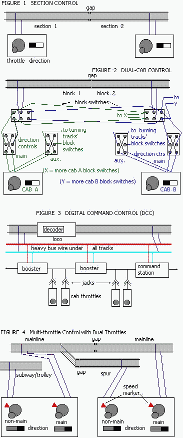on the trains on our walk-around layout. So here we were with no options that would satisfy us. Each of the following had some neat and attractive features that would work for us but others that were not on the same wavelength as where we were at: Aristo-Craft's Train Engineer, ALPS-3000, Digitrax (especially the wireless stuff), Dynatrol, Ramtrax, Remote Control Systems of Illinois, Roadmaster from Signal Research, System One, and others. None met our admittedly tough criteria. So then I went to logic alone and tried to use everything I knew to evolve a new method that exactly fit our needs. It took a couple of days but at the end of the process I had what I'm calling Multi-Throttle Control. I didn't even realize at first that it was essentially section control—the same type of control I'd used as a kid with Lionels. Nor did I remember the name for that control method. It look Westcott's classic wiring book, cited above, to refresh my memory on that one. But now it's time to look at why this turned out to best fill our needs, and to do that I have no choice but to go back and re-examine why people quit using it and why people mostly seem to feel it's obsolete for serious modelers (although it's obviously quite popular with starter sets that kids get for Christmas). An Abandonment Re-examined Here's why the method was dumped: • a large quantity of throttles would be too expensive • limited flexibility of control • speed-ups at section boundaries Let's go through these one by one. Is buying a bunch of throttles too expensive? Standard Hobby Supply or Rio Grande are both eager to sell you MRC's #2800 Dualpower throttle for about $41 or $20.50 per throttle control, since each Dualpower is two throttles in one. I needed 22 of these because I have 43 sections needing power, half on the mainline and half not. This turns out to be about 1/3 to 1/2 of what wireless DCC would have cost me (depending upon options and whether I got the decoders put in or did it myself), considering everything. For instance, I hate points cleaning and insist on powering my turnout frogs with my Tortoises' built-in accessory switches—recall the above "low maintenance" criterion. But you can't switch more than an amp of current with a Tortoise, according to Circuitron, the maker, so this means an additional $14 a pop for relays for the Tortoises' accessory switches to operate because DCC uses over an amp. And since I have 73 Tortoises on my layout, that's quite an expensive proposition. So it turns out that if expense is a criterion, you should be going toward section (specifically, Multi-Throttle) control, not away from it. Note: Just to be clear, cab control is cheaper than Multi-Throttle control, but DCC is more expensive than all the other methods, therefore Multi-Throttle control is priced about average, compared to other control systems. Next: limited flexibility of control. Since there are many hobbyists like my wife and I who have figured out how we want to do things and do not need the flexibility to do it some other way (especially since we have our other layout for that purpose), this is not a real issue. Our goal is to have an operational method that fits our criteria, not one that might please others or fill others' needs. When I get into how one runs Multi-Throttle walk-around layouts and how they compare with DCC, you'll see that the system has its own flexibility and is a delight to use. Finally, there's the issue of speed-ups at section boundaries. I spent hours (on my dual cab-control layout) experimenting with trains going from one block to the next where every other block is controlled by cab A and the rest by cab B. I used N-scale Atlas, Kato and Life-Like locos, Peco turnouts, single-throttle MRC Railpower 1370s, and careful observations at all block boundaries: There were no speed-ups at block boundaries. If you set the throttles to the same speed, you won't even know when a section boundary is hit and a new throttle's power is encountered. If you set them to different speeds, they obey and change speeds at boundaries—which actually turns out to be very useful in Multi-Throttle Control, as you'll see below. Then I built my Multi-Throttle layout with 22 Dualpowers and 43 separately controlled sections. I tested block boundaries again. There were mild speed-ups at 40% of the 43 section boundaries, but none at all on the rest. This was a disconcerting little mystery as it contradicted the tests I'd made with other MRC power packs, and it made no sense that close to half of them were acting up. |