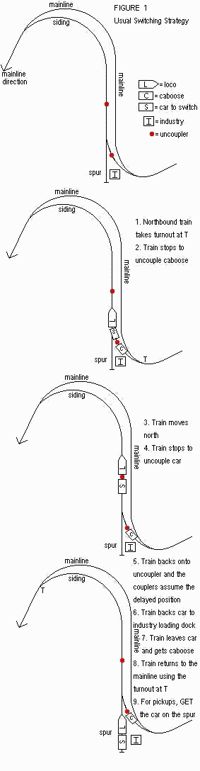 • Just the right amount of switching operations: The average consist on the layout has two cars that need to be actually dropped and picked up. Normally this requires throwing a set of siding turnouts, pulling onto a siding in order to keep the mainline clear for other traffic, throwing the set of siding turnouts again so the mainline priority position is observed, operating an electromagnetic uncoupler with a pushbutton to uncouple the caboose, pulling forward to the next uncoupler and uncoupling one or more cars, throwing a turnout, backing the train and using delayed uncoupling mode as I push the car(s) onto a spur, pulling forward until the turnout is cleared, throwing the turnout, backing up and re-coupling the caboose, throwing the set of siding turnouts, pulling out onto the mainline, and once again throwing the set of siding turnouts. One toggle switch controls both Tortoise switch machines at once so that both are either in the mainline or siding position. See fig. 1. Other types of switching operations will be covered later.