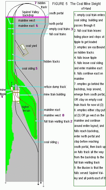 exits the mainline at the Black Hills turnoff. But there's more to the trick: Right when the empties are entering the mine building complex shed, a hidden full coal train (it had been concealed under a nearby hill) enters the building from the other side and comes out of the end of this building and stops under the coal tipple. The illusion is that the empty train that just entered the building is now under the tipple getting filled. I wasn't about to risk black lung disease by loading real coal via real tipples, so I had to simulate the empty-to-full scenario. This full coal train leaves the coal siding and switches onto the mainline. It follows the mainline up through the Squirrel Valley backdrop, a turnout is thrown, and the train now backs up all the way to its hiding place under the hill southwest of the mine. The illusion created is that many points east of the mine get served by this full train, and when the empty train goes around the entire 210-foot layout, points east must have emptied it of coal. It should go without saying that this trick also needs the aid of my not-much-to-look-at Opto-Sensor assistants, because panel lights that locate train position are the best way I found to perform all the hidden train operations. See fig. 5. |