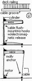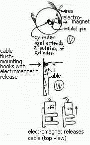 of deck dwellers. See figures Q and W. V. Electromagnetic Blanket Cylinder Release Mechanism. The cylinder cannot unroll until this mechanism has been activated from a button inside the house, because the roller's end has a pin welded sideways on it that allows turning to be prevented by the electromagnet's bolt. Similarly, the blanket cannot reroll without activating this release. |