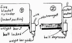 inconveniences of the anchor-and-dual-hooks method. Y. Alternate Fire Blanket Cylinder Lock. Note that in figure V the electromagnetic blanket cylinder release mechanism needs to be operating the whole time the blanket is either being unrolled or rerolled. But with the electromagnetic door-lock-styled release in figure Y and Z, you can have a release that not only manages not to get in the way of an end-mounted cylinder motor, but also manages to make it unnecessary for people to keep the release electromagnet on for more then a couple of seconds during unrolling—and it needn't be used at all during rerolling. (See the S part of figure G to see how a nub on the cylinder in combination with an electromagnetic door lock is similar in operation to figure Y's release, except that the former is stopping the cylinder from pivoting while the latter is stopping the weight rod and blanket from moving until release.) Note that the weight rod, when being retrieved as the blanket is being rerolled, simply depresses the spring-loaded bolt of the electromagnetic door lock mechanism—like a door would—as it is settling back into its perch. All this is simply a new use for an old technology. |