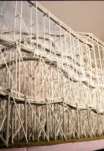 Gravity Versus Scale Modeling Having just received a Micro.Mark Bending Machine (#81356, $79.95, for wood, plastic, or metal) via UPS, I took it into my workroom and learned how to bend N-scale track. It involves putting the flextrack between two rollers, tightening down four set-screws, and turning a crank and examining the type of curve you're getting. Then you adjust the screws and try again. The critical thing is keeping the track straight so you don't end up with a spiral. With a little practice, you can make dandy roller coaster track. With a 90-degree dip in hand, I fastened a full piece of flextrack to each end of the dip track and used a whole table full of cut-up blocks of Corningware foam insulation (which I'd bought just for the roller coaster) for supports. The track decline before the dip and incline after the dip were 45-degree angles. A little Atlas ore car was put at the high end of one of the flextracks and let go. And you can probably imagine what happened next! Not only did it derail and go flying off the table. Oh, no, that was just an insignificant detail. The main occurrence here was an ore car going so fast it was almost invisible! I had learned something about gravity that we all kind of intuitively and covertly know, but now the concept was very overt and staring me in the face: In order for a roller coaster to act appropriately in a 1/160th scale (N) model, it would need 1/160th scale speed, and in order to get that it would need 160th scale gravity, and not even Captains Janeway, Kirk, Picard or Sisko could manage that one! In other words, if the acceleration of gravity is 32.17' per second per second for a great big freight car, then it is also that for an N-scale car, and the upshot of all this is that I can expect experiments to show that as long as my roller coaster is on Earth and subject to Earth gravity, I will most certainly get cars going 160 times too fast! For example, if a real coaster car was on a decline that let it accelerate exactly half as fast as a dead fall, so that it ended up traveling 48.25' in two seconds (dead fall is 32.17 + [32.17+32.17] = 96.51' after two seconds), then a 160th scale N-gauge car should go 0.3' (less than 4") in two seconds, but it doesn't. It goes 48.25' as well (leaving inertia, friction, wind and other factors out of the calculations for the purpose of clarity). Common sense told me it was time to throw in the towel (and the physics book). But I never like to let a little thing like FUNDAMENTAL LAWS OF THE UNIVERSE get in my way! Oh no. And so my journey into the roller coaster Twilight Zone continued. The only way I could get sensible speeds out of the ore car was with subtle track bends. I experimented for a day and found that each piece of flextrack should have 3 hills and 3 dips, all using a vertical curve radii of 8.75". The first hill should be 2" tall and the other 2 hills 1" tall. This track would cause an ore car to accelerate down the 2" high hill of track and slow nicely on the first 1" hill and nearly stop on the second 1" hill but still make it over the hump. Since this kind of subtle curvature was understandably only 160th as pronounced as that of a roller coaster, I had to ask myself if it was worth going on. To me it was, because I still had a very interesting system evolving, and I had a yen (and a few dollars, too) to push the envelope and see how far I could take it. |
