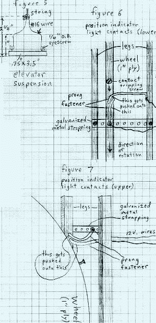 Elevator Design I considered and rejected many ideas, but finally settled upon turning a big 20-inch plywood wheel with an electric motor and getting my reciprocation (up/down elevator action) from an off-center bolt fastened to the wheel. No motor I found turned out to have both the right speed and the right power, so I ended up installing a chain-and-sprocket-based speed reduction system. The end result was an elevator that took 7 seconds to go either up or down. I installed position indicator contacts made from unused prong fasteners (for binding punched paper reports—ask any stationery store if this is unfamiliar—see figs. 6 and 7) to light up 12-volt indicator bulbs (hooked up to my layout's 12-volt lighting bus) to let me know when to shut down the motor when the elevator was either all the way up or down. A screw sticking out of the rim of the wheel operates the indicator contacts. This would have been a nasty timing issue for the elevator operator (who do you know that can time toggle operations to within a split second by hand?) except that when the wheel is in operation, it doesn't actually move the elevator much when the off-center bolt is between 5 and 7 o'clock or 11 and 1 o'clock, so making the elevator stop at the right place required no more than a normal reaction time response from the operator. When I start up the motor, I wait a little less than seven seconds and a position indicator light goes on, so I shut off the switch. The indicators need to light up when the bolt position is at 11:40 and 5:40—this suffices to get the bolt stopped at the needed 12:00 and 6:00 positions. If you want a slow reaction time to suffice, install the contacts so that 11:30 and 5:30 indicator lights occur—or even "earlier." Pulleys and thick string transfer the reciprocating action from the bolt on the wheel to the 15.75-inch-long logging elevator, which is hoisted 15.5 inches, or over two inches per second. (See fig. 2.) The motor is an Oriental Motor Co., Ltd. Product (115-volt, 1 amp—less power doesn't work: I tried it) I got from a surplus electronics store with 2900 rpm (48.3 rps [revolutions per second]) and a 1:11 gear reduction box connected to it (which gave 4.4 rps), but it was four times too fast (I needed about 1 rps) so I hitched it up to a 10-tooth to 40-tooth chain and sprocket speed reduction system I built from parts from the local sprocket supply house. The roller that turns the big wheel is a simple 1-inch sanding cylinder roller available at any hardware store. Because the elevator is centered in some benchwork on the Squirrel Valley Railroad, it had to be built first, and the 4' x 8' benchwork lifted over it, in order to preclude future logistics nightmares come installation time—it's 6' tall! |