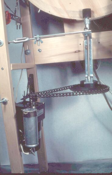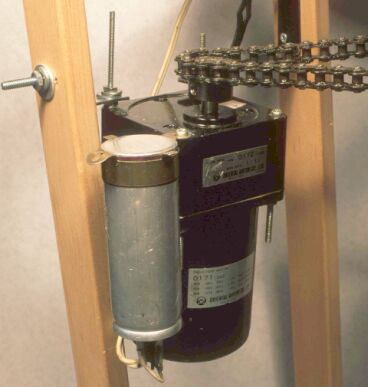 In order for the elevator to function properly, I found it needed the following: • smooth corner guides for the elevator—I added smooth 1/8" acrylic sheeting over the guides where the roughness of the wooden elevator guides caused unwanted rocking of the moving elevator (figs. 2 and 3 and 5) • precise upper and lower stopping guides for the elevator so it's at the same heights as the upper and lower layout tracks when it stops (fig. 2) • capacitor start on the motor to get it started—luckily, this also came with the motor I settled on; some other motors that I tried failed because they had no capacitors • no more than 1/16-inch gap between layout rails and elevator rails when it comes to rest • power to the elevator train track rails from 24-gauge (stranded) dangling wires arranged so as to have no pulling effect on elevator motion • a rubber roller (which the motor runs) that is tight against the plywood wheel so that it can't slip (I installed a 1.5" bearing/wheel on the opposite side of the plywood wheel from the rubber roller—the two rollers balance each other; to adjust the tightness of the bearing against the wheel I used a ¼" eyebolt with two wing-nuts which allow precision adjustments of the bearing because the eyebolt holds tension against the bar that holds the bearing) (fig. 4) • a slight (one degree?) tilt to the whole 6'-tall elevator assembly so the elevator will favor the smoothest acrylic-covered guides, act consistently, not waver or swing, and always end up in the same spot, since the locos can't successfully negotiate the transition from elevator track to layout track—or vice versa—if the tracks aren't nicely lined up before throttle-up |