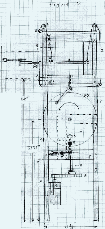 A = lower elevator track entrance B = big 40-tooth sprocket C = capacitor D = double enclosed parallel pulleys E = enclosed pulley F = 1 x 4 (.75" x 3.5") G = gearbox H = ¼" shaft I = 1/8" string J = 20" diameter plywood wheel K = bearing used as roller L = L-bracket M = motor N = upper elevator track entrance O = 1 x 2 (.75" x 1.5") P = nonenclosed pulley Q = ¼" shaft coupler R = rubber sanding cylinder roller (1" x 1") S = 10-tooth sprocket T = turnbuckle to tighten chain U = log train elevator V = indicator light mount W = wire elevator holder X = contact tripping screw Y = indicator light mount Z = eye screw * = chain & = upper stopping guide # = lower stopping guide @ = string tautness adjustment pulley |